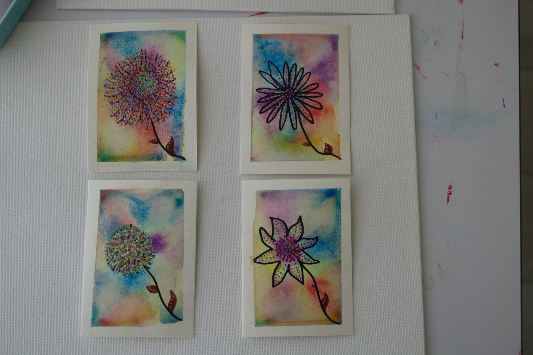 Each hand-painted ACEO in this four-part series began as a soft watercolor wash, then found its rhythm through layers of ink and color.